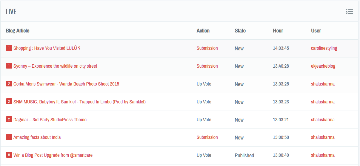 On the live page, you can check the status of each of the posts. For those which have been recently submitted, their action would be 'Submission'. For those which have received a vote, their state would be 'UpVote'.