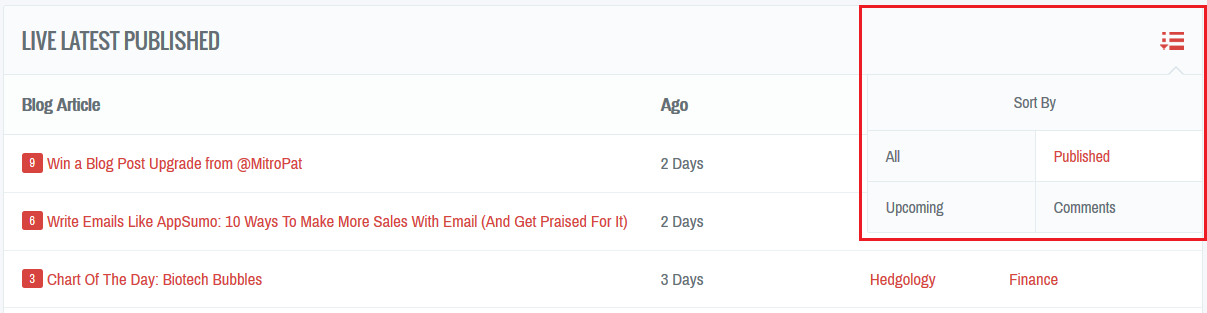 From the Live Page, you can also sort posts based on Published, Upcoming and Comments.